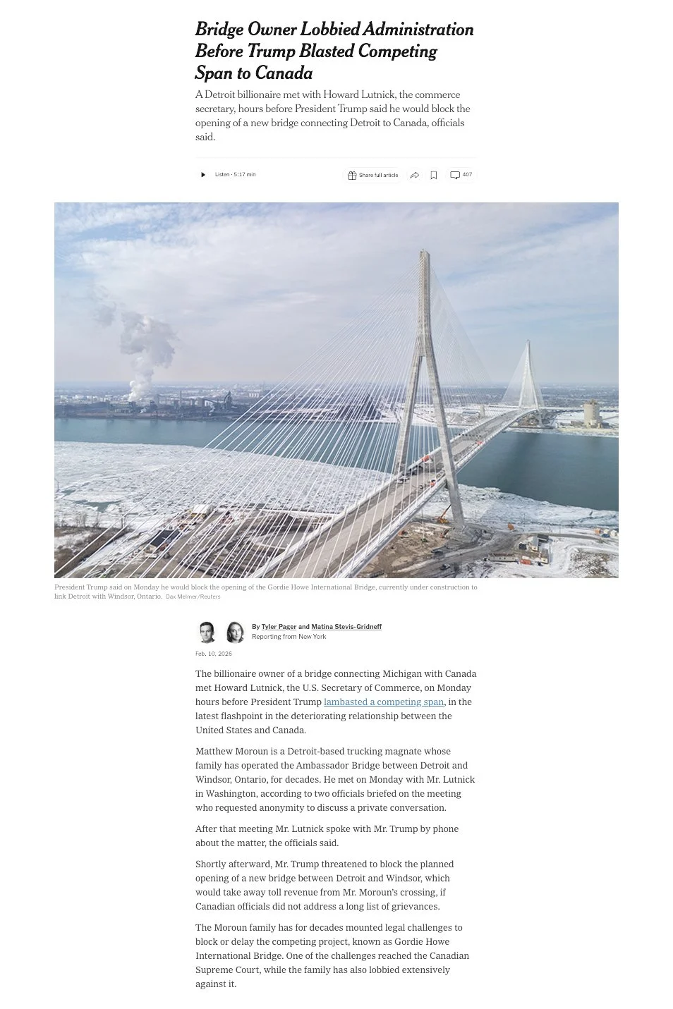 I finished my morning job and headed to Sandwich to capture aerial video and stills of the Gordie Howe. After submitting my work I learned the New York Times had a scoop - Matthew Moroun, the billionaire owner of the Ambassador Bridge (the privately-owned crossing between Detroit, Michigan and Windsor, Ontario), met with U.S. Commerce Secretary Howard Lutnick on the afternoon of February 9, 2026 — just hours before former President Donald Trump posted on Truth Social threatening to block the opening of the new Gordie Howe International Bridge. The feature photo on the story was an aerial I had just submitted to Reuters. The story had reach from Trump’s original post but the NY Times scoop poured fuel on the story and for a time dominated the conversation surrounding the issue.