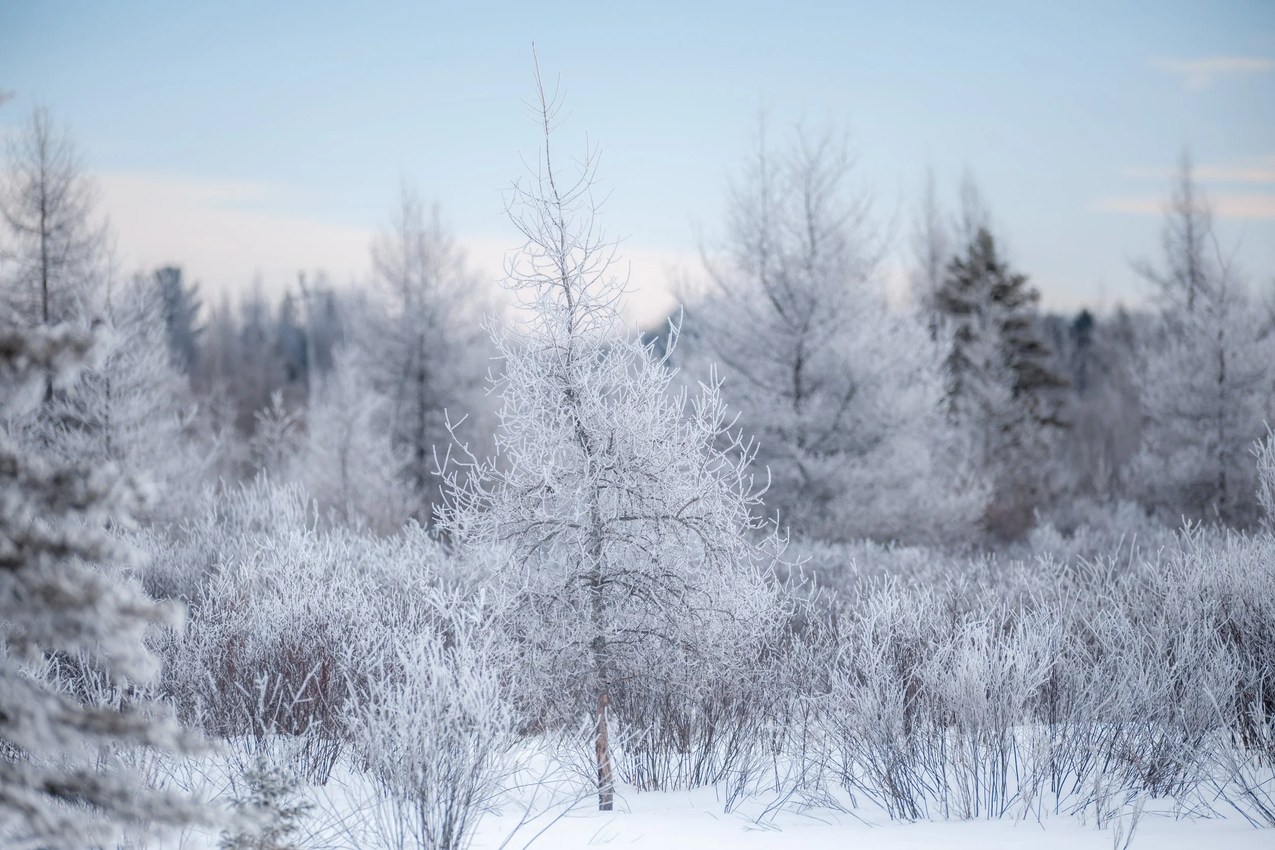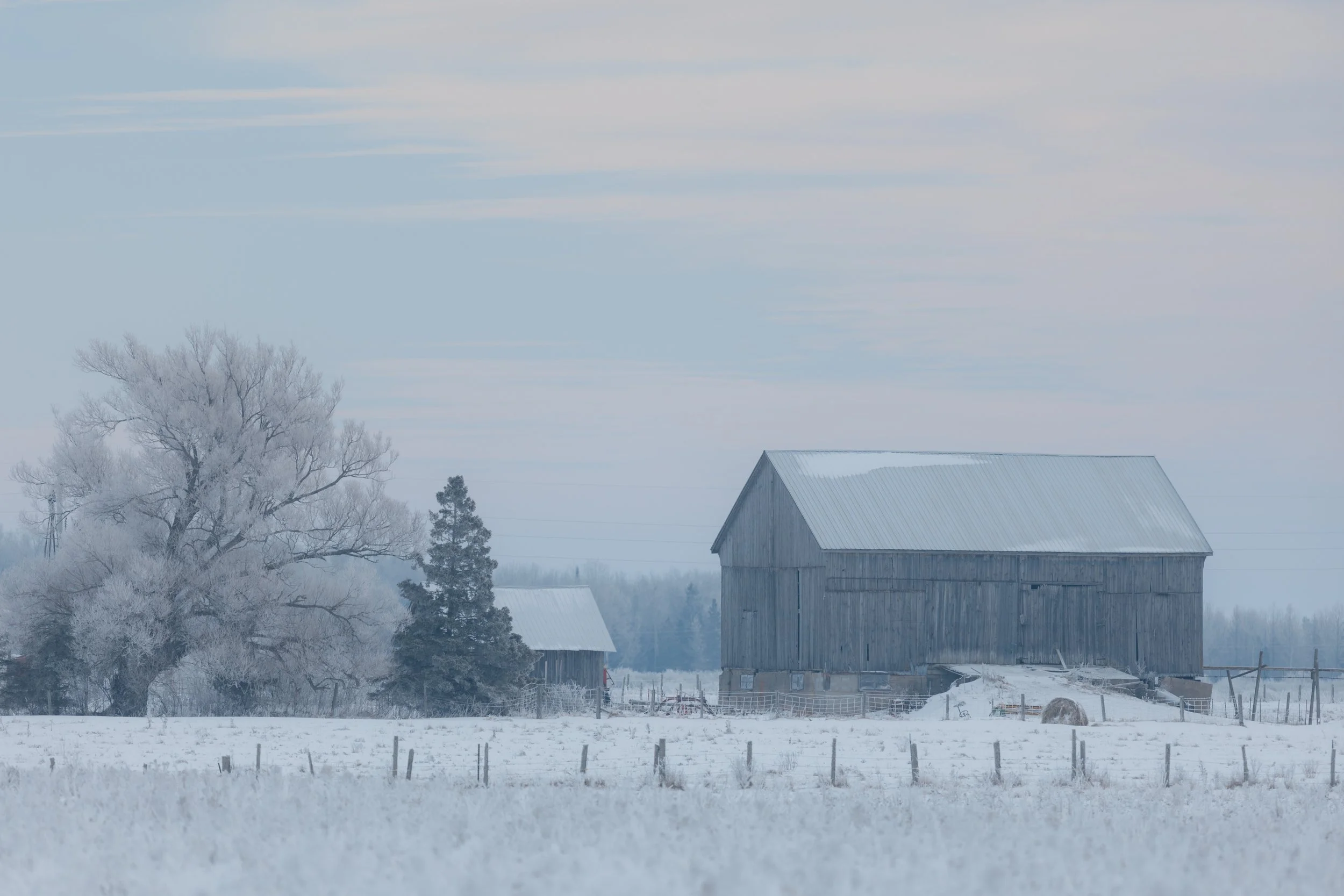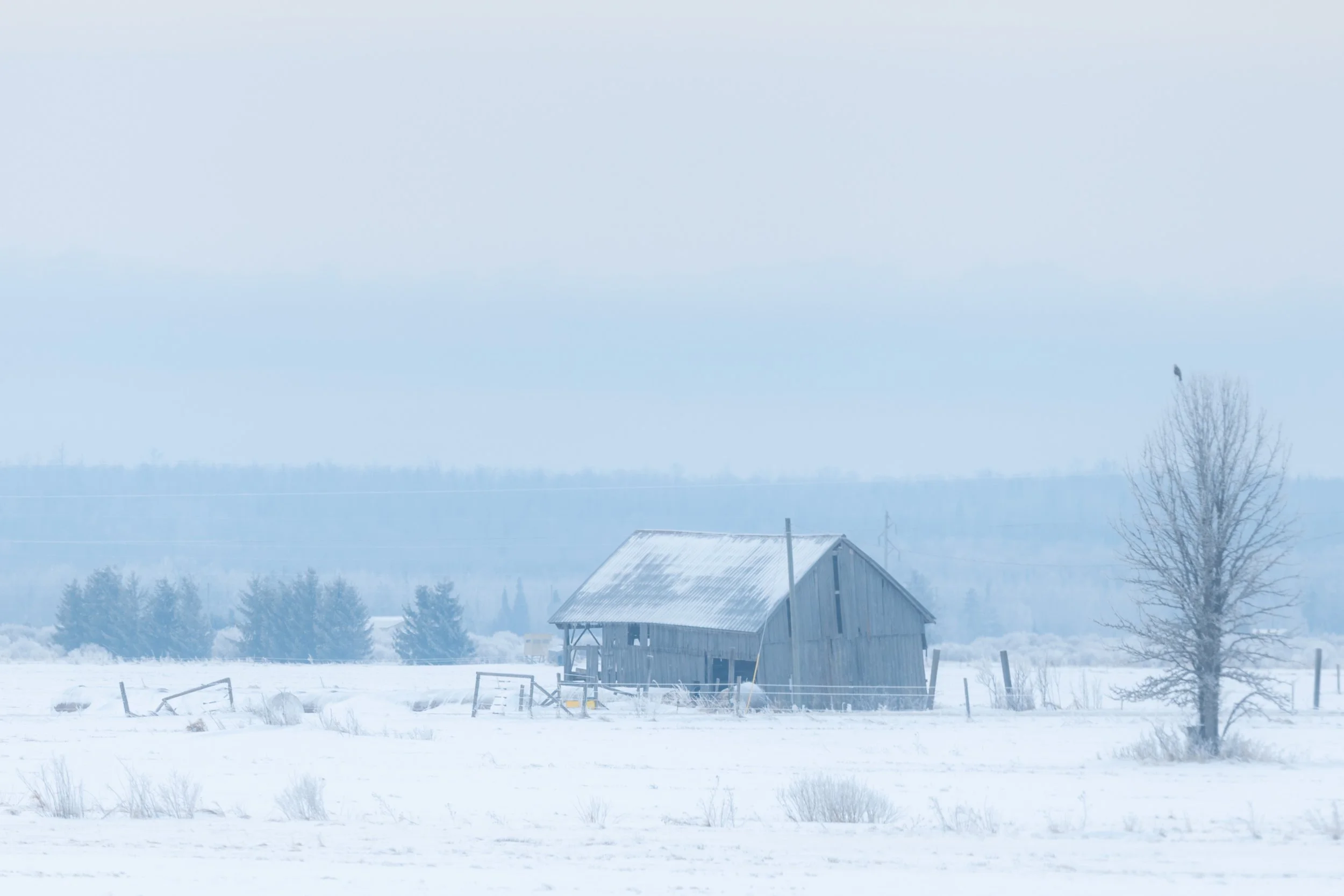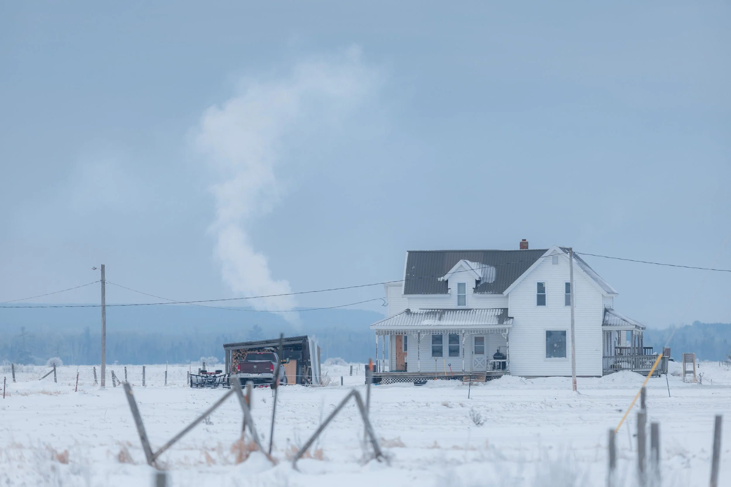 And it’s not only owls that show up here, as I quickly discovered roaming the snowy county roads. Bald eagles, red tailed and rough-legged hawks where all seen within the first hour. Northern finches too. The landscape had an icy aesthetic and the sun was faint, hiding behind a thin layer of upper-level clouds. The area had a weathered, pastoral charm. Crystallized snow clung to the trees while chimney smoke lingered in the cold northern air. I had discovered an image-maker’s paradise. But no owls.