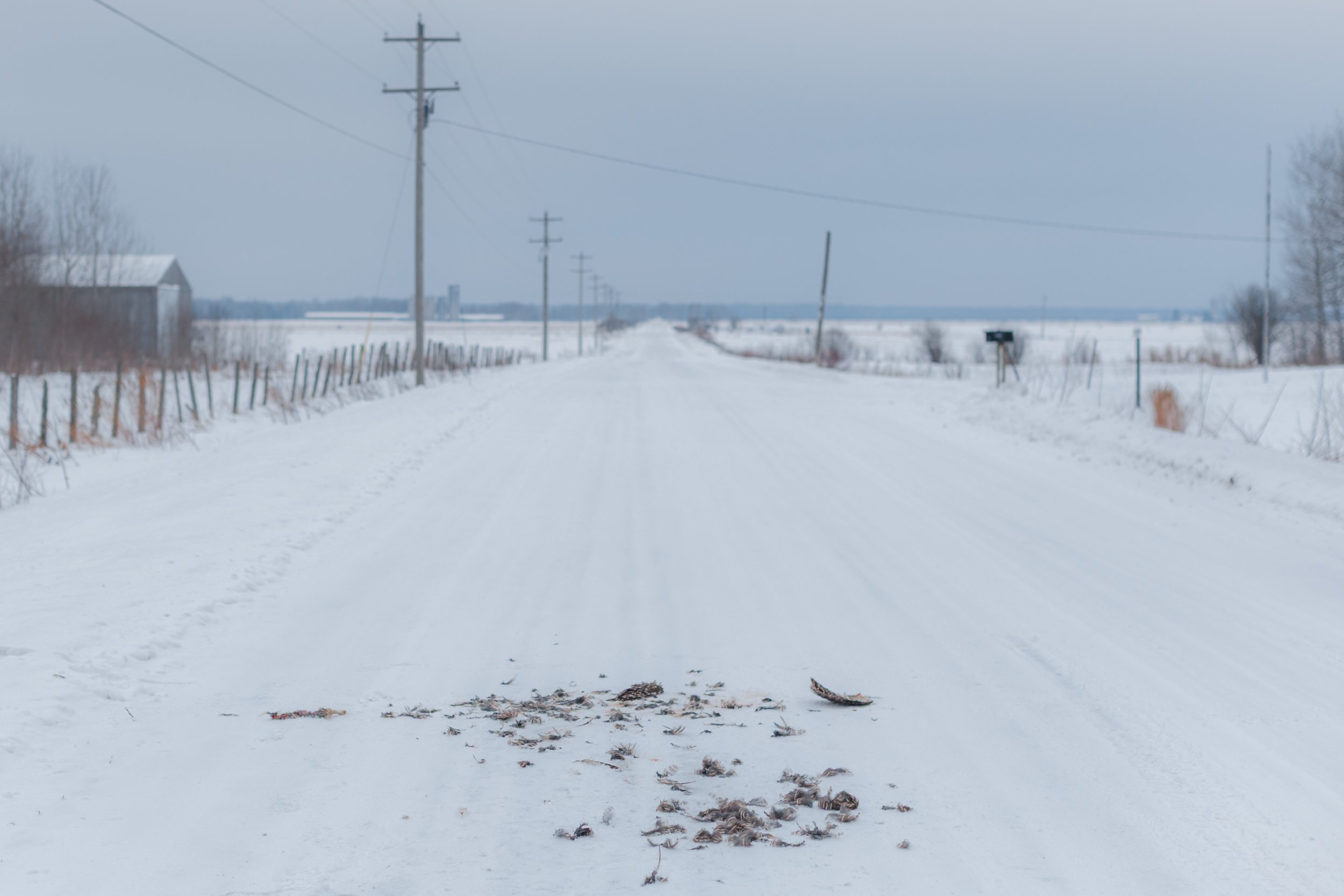 The next day I returned to the Rudyard Loop. It was overcast and the temperature had risen just above freezing. What had been a winter wonderland a day earlier was now undone. I began criss crossing the area, coming across an unusual fresh kill of a bird of prey of some kind with only the wings and legs remaining, as well as the welcoming sign to Rudyard - a giant snowy owl, which might have been my only sighting of the arctic bird.
