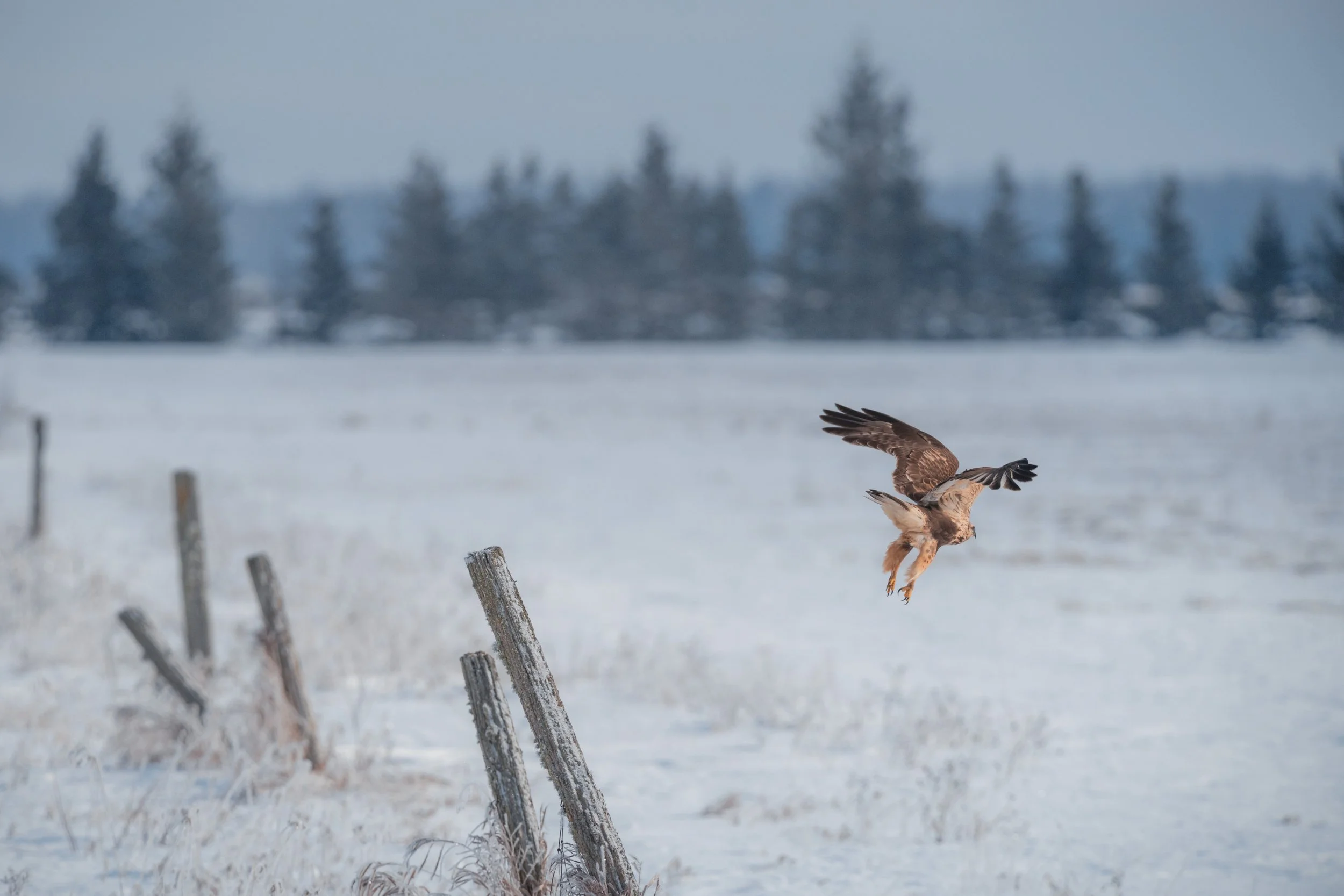 A rough-legged hawk takes flight from a fence post in the hay fields surrounding Rudyard in Michigan’s Upper Peninsula.